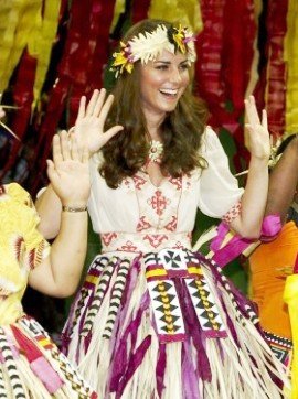 En la última aparición de la duquesa de Cambridge, hemos visto a Kate vestida con el traje típico para bailar el hulla hulla, con una corona de flores en la cabeza y riéndose con sus compañeras de danza. Lo cierto es que Kate está sorprendiendo a todos con su naturalidad, su belleza y su espontaneidad ante lo que surja en cada acto, como cuando fue trasladada junto al príncipe Guillermo hasta el avión que les llevaría a Tuvalu, en un trono creado para el matrimonio.