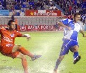 Los catalanes, atentos e inteligentes, han sabido adaptarse mejor a las difíciles condiciones del césped por culpa del aguacero, cambiando su habitual fútbol de toque por el balonazo largo en busca de su crack y máximo goleador, Aníbal Zurdo