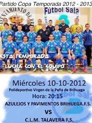 Vuelve la Copa del Rey al Polideportivo Virgen de la Peña de Brihuega. Será el próximo miércoles 10 de octubre y medirá el equipo briocense contra el Talavera, un equipo que la temporada pasada compitió en la máxima categoría del Fútbol Sala español y que cuenta en sus filas con jugadores de contrastada calidad y varios años de experiencia en la 1ª División, como Justo Cáceres y Nando, entre otros. Sin duda un partido atractivo y de altos vuelos, para el que los pupilos de Rubén Barrios necesitarán de todo el apoyo de su gran afición. Encuentro éste, que dará comienzo a las 20.15 horas, y que se disputará a eliminatoria directa, de tal forma que el vencedor del mismo pasará a la segundo ronda de este fascínate torneo.