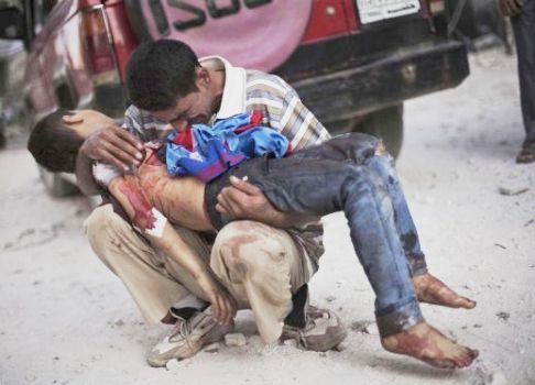 | La imagen ganadora del premio Pulitzer: un hombre sirio llora sobre el cuerpo de su hijo cerca del hospital de Aleppo, en Siria (octubre, 2012). / MANU BRABO (AP)