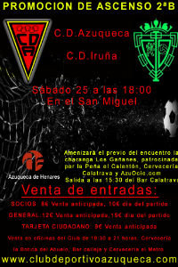 El club Deportivo Azuqueca jugará su primera eliminatoria de play-off de ascenso a Segunda División B en el San Miguel el sábado a las seis de la tarde. El rival, el CD Iruña, ha jugado esta temporada en el grupo décimo quinto de Tercera División. Los navarros, al igual que el equipo de Miguel López, han quedado terceros de su grupo y han conseguido 67 puntos, dos menos que los azudenses, con 19 victorias, 10 empates y 9 derrotas.