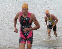El primero en salir del agua es Jordi Giménez (dorsal 29), visiblemente cansado. Y casi al mismo tiempo salen también Aída Valiño (2) y Brais Canosa (18). En todos los rostros se nota la fatiga. Respiran despacio antes de emprender el camino a Atienza, en plena transición. Poco a poco van saliendo todos los nadadores, y todos escuchan también el ánimo del público mientras cogen la bicicleta: "Ánimo, Ana", "Venga, Juan", "¡Vamos, Nachete!"...