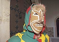 Así pues, esta botarga, peculiar en su atuendo, que no en su proceder, tapa su cabeza con capucha rematada en cuernos y con careta –por desgracia de moderno plástico- para dar más pavor a los niños y no ser reconocido –naturalmente tampoco habla-. Del cinturón cuelgan cencerros y campanillas que se unen al alegre sonido de los cascabeles cuando salta y persigue a los niños y mozas con su porra.