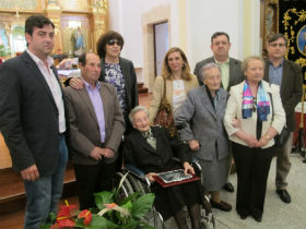Tras la emotiva celebración llegaron los homenajes. En nombre del Ayuntamiento de Cabanillas del Campo fue su alcalde, Jaime Celada, el encargado de rendir tributo a la centenaria con la entrega de una cesta de flores y una placa conmemorativa. El regidor –que asistió a la Eucaristía acompañado por los concejales Estela Iturregui, Antonio Ruiz y Julián Rodríguez– puso en valor actos como el que el domingo se celebró en la localidad “por lo que tienen de agradecimiento y recuerdo hacia nuestros mayores”. Asimismo, Jaime Celada puso a Sabina Riofrío como ejemplo de bonhomía y buena vecindad, “lo que le ha hecho merecedora del cariño de multitud de cabanilleros”. También hubo homenaje popular, con la entrega de un libro de firmas en el que, durante los últimos días, decenas de vecinos han ‘rubricado’ el afecto que profesan a la centenaria.