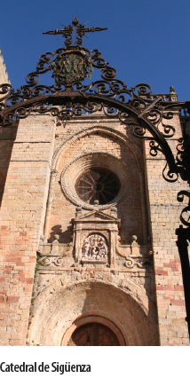 Sigüenza es la ciudad mitrada de Guadalajara, presidida por su catedral (siglos XII-XIII) en la que dominan, principalmente, los estilos Románico y Gótico. Mandada construir por el obispo Bernardo de Agén en el siglo XII, su arquitectura mezcla elementos de edificación militar y religiosa, y en ella destaca un magnífico rosetón románico, el acabado balaustrado de su portada y sus dos torres de planta cuadrada del siglo XVI, así como el edificio de la secretaría del cabildo, de estilo Plateresco. En su interior se dan cita numerosas obras de arte en forma de altares, retablos, baldaquinos, capillas... Entre ellos es imprescindible reparar en la Sacristía Mayor, conocida también como de las Cabezas, y en el sepulcro de don Martín Vázquez de Arce, el Doncel de Sigüenza.