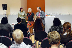| El alcalde, junto a Eva Ortiz (centro), antes del inicio de la conferencia que impartió Estrella Ortiz (izquierda) con motivo del Día del Libro. Fotografía: Álvaro Díaz Villamil / Ayuntamiento de Azuqueca de Henares |