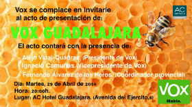 El próximo martes 29 de Abril a las 20:00h. se celebrará el acto de presentación de Vox Guadalajara. Será un acto encabezado por Alejo- Vidal-Quadras que también contará con las intervenciones de otros miembros del Comité ejecutivo provisional de Vox; y la participación de Fernando Álvarez de los Heros, coordinador provincial provisional de Vox en Guadalajara. SIGUE