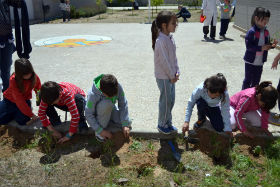 En esta ocasión, todo el colegio se reunió en el mismo patio en el que está ubicada la estación meteorológica y los frutales que se plantaron en ediciones anteriores de esta misma iniciativa, para unir a la tierra, a partir de las doce y media de la mañana y en dos turnos, 150 plantas aromáticas. Los 120 niños y niñas del cole, así como todos los profesores, cavaron los agujeros para unir a la tierra espliego, poleo y lavanda.