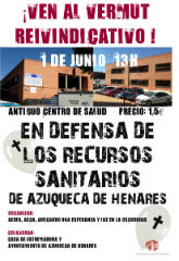 Las asociaciones sanitarias de Azuqueca de Henares -AERFA, AECA, Buscando una Esperanza y Luz en la Oscuridad- han convocado un acto reivindicativo "en defensa de los recursos sanitarios de Azuqueca" este domingo, 1 de junio. La concejala de Protección de la Salud, Elisa Cansado, ha mostrado el apoyo del Ayuntamiento a esta convocatoria y ha animado a los ciudadanos a sumarse al acto, un vermut reivindicativo, al precio de 1,5 euros, a las 13 horas, junto al antiguo Centro de Salud. SIGUE