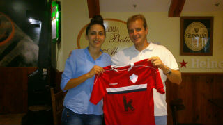 A pesar de su juventud, con apenas 20 años es una de las veteranas del equipo rojillo, ya que lleva desde los 15 años compitiendo en la categoría. Se trata de una jugadora que suele jugar de pívot, con muy buen trato al balón, que sabe jugar de espaldas y con un gran disparo. Una gran noticia para el club, que sigue completando su plantilla, que en esta temporada ya cuenta con cuatro caras nuevas. Las chicas de Ángel Luis Gutiérrez se pondrán el mono de trabajo el día 19 de agosto, día previsto para comenzar la pretemporada. En la imagen aparecen Sara y Braulio, directivo del Club, en la Cervecería La Botica del Abuelo.