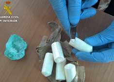 Una vez detenido el vehículo e identificados sus ocupantes, la Guardia Civil localizó debajo del asiento delantero derecho un paquete envuelto en cinta de embalar que contenía en su interior cinco cilindros recubiertos con plástico y una bolsa que contenían una sustancia blanca, al parecer cocaína, por lo que los agentes decidieron trasladar a estas personas a las dependencias policiales para el total esclarecimiento de estos hechos.