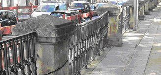 El taller de empleo está limpiando los restos orgánicos adheridos a la superficie del muro de contención y la barandilla, y también del óxido y de las antiguas capas de pintura. También se están limpiando y reparando las piezas de fundición deterioradas y se están reponiendo las macollas que no se pueden reparar o están perdidas. Por otro lado, se está aplicando un tratamiento con imprimación anticorrosiva.