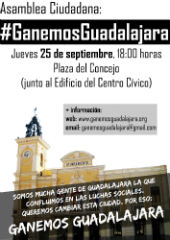 Con esta ilusión hemos convocado una Asamblea Ciudadana el próximo jueves, día 25 de septiembre a las 18 horas en la Plaza del Concejo –si el tiempo lo permite, si no se realizará en el Centro Municipal Integrado Eduardo Guitián- para poder entre todos Ganar Guadalajara.