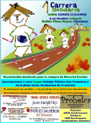 El AMPA ‘Conde Lucanor’, en colaboración con el Colegio Público San Francisco y el Ayuntamiento de Cifuentes, celebrará el domingo 9 de noviembre, la primera edición de la Carrera Solidaria en la Plaza Mayor y sus inmediaciones, en la que habrá seis categorías (chupetín, prebenjamín, benjamín, alevín, infantil y absoluta) en categoría de masculino y femenina, siendo premiados los participantes que finalicen la carrera con una medalla donada por establecimientos de Cifuentes (Estanco Javier Marigil Viejo, Muebles Salmerón, Panificadora Cifuentes, Productos Helena Cabellos “PROHELCA” y Supermercado J. del Monte), y finalizando con una chocolatada, cortesía del AMPA Conde Lucanor. SIGUE