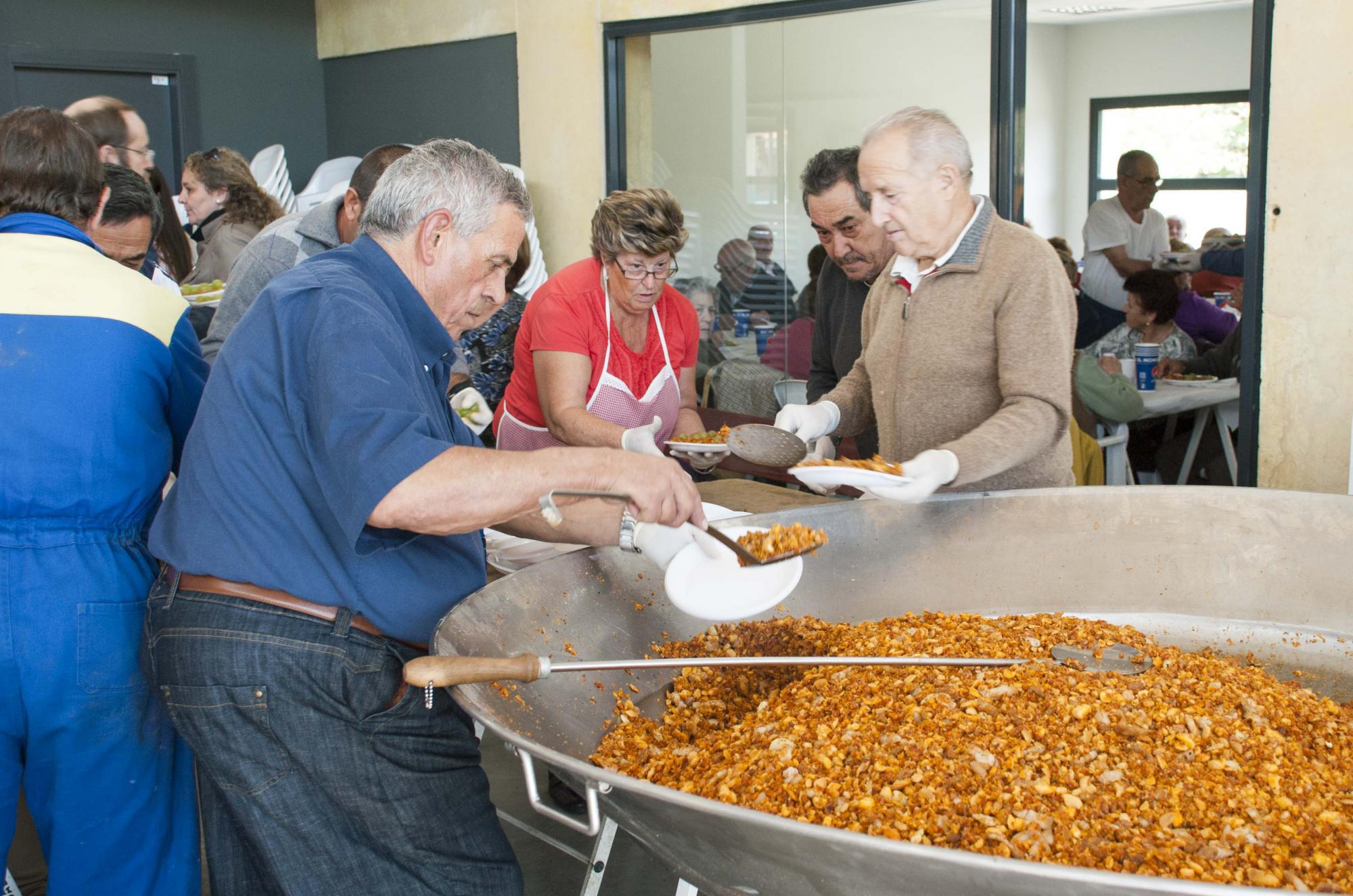 En esta ocasión el tiempo no ha acompañado, por lo que ha debido trasladarse su celebración desde la Plaza Mayor, frente a los pórticos de la Iglesia, hasta el Espacio Joven, el lugar más amplio y cercano donde el consistorio le ha ayudado a instalarse. Mañana continuará la fiesta con una caldereta.
