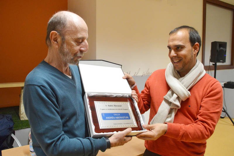 Andrés Aberasturi recibe una reproducción de la placa que da su nombre a una calle de Azuqueca