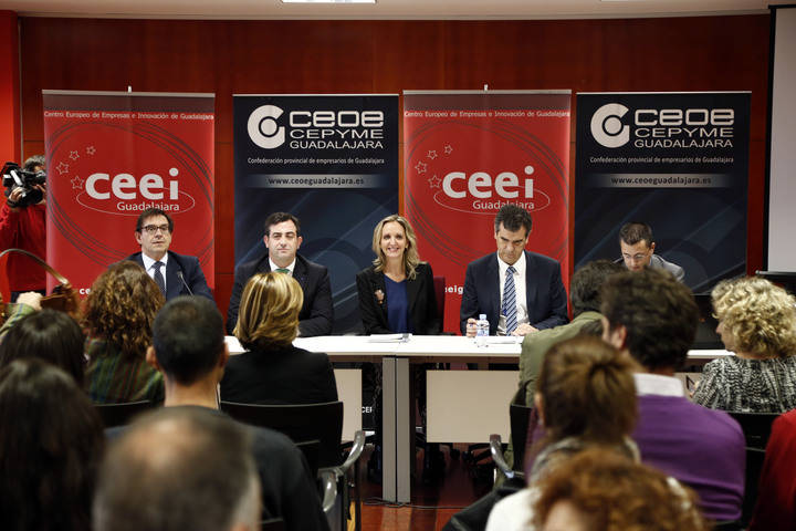 La titular de Empleo y Economía, acompañada por el alcalde de Guadalajara, Antonio Román, el de Cabanillas del Campo, Jaime Celada, el delegado de la Junta, José Luis Condado, el director de programas Business Management Education de la EOI, Ramón Gurriarán y los representantes de la empresa Teddy Dreams, ha incidido en que “Castilla-La Mancha tiene talentos suficientes para poder convertir las ideas en proyectos empresariales rentables y generadores de empleo”.