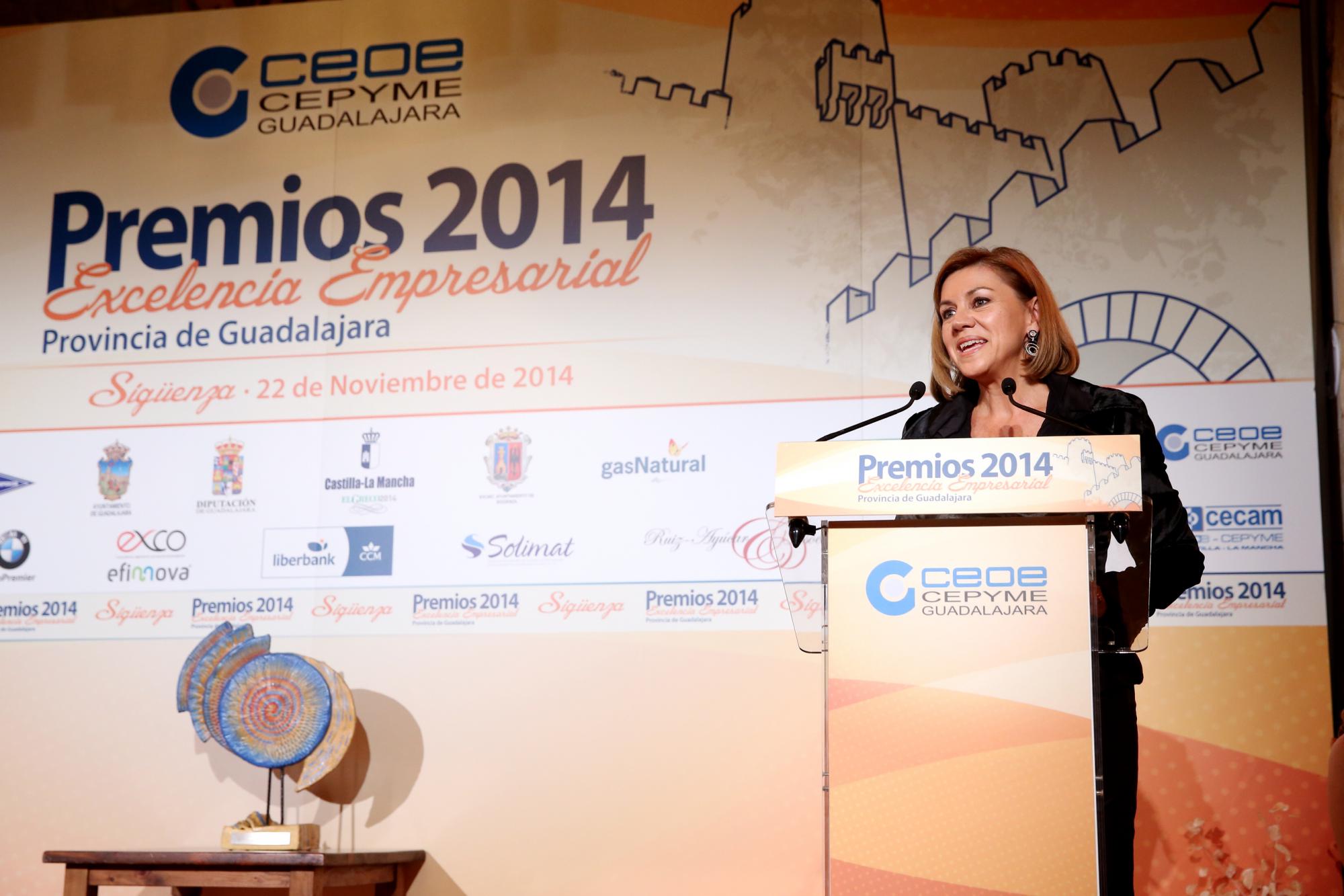 Durante la entrega de los premios Excelencia Empresarial 2014 de CEOE-CEPYME Guadalajara, que se ha celebrado en Sigüenza, Cospedal, que ha afirmado que en lo que llevamos de legislatura se han realizado en Castilla-La Mancha cerca de 130.000 contratos indefinidos, de los que 19.000 son de la provincia de Guadalajara, ha recordado que el principal objetivo del Gobierno regional es la generación de empleo. Por ello, ha señalado iniciativas impulsadas por el Ejecutivo autonómico como el Programa Empleo Plus, “a través del cual financiamos con 6.000 euros por trabajador contratado de forma indefinida y que mantenga su empleo durante al menos dos años”.