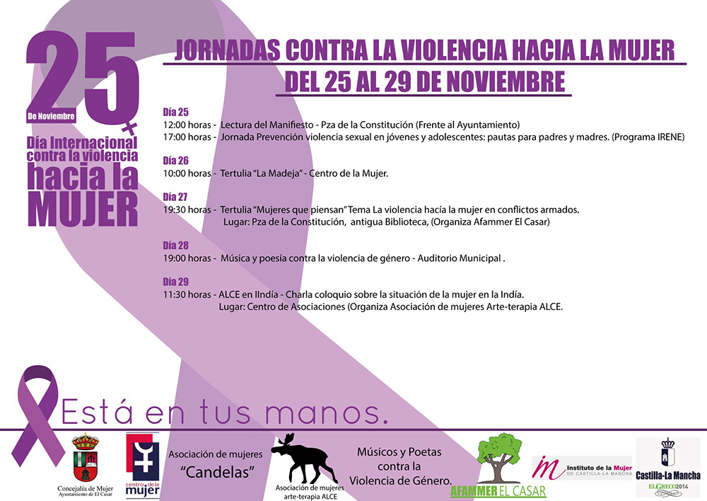 Bajo el lema “Está en tus manos”, El Ayuntamiento de El Casar, a través de su Concejalía de Mujer y el Centro de la Mujer, junto con distintas asociaciones y colectivos de la localidad, celebrará durante toda esta semana diversos actos dirigidos a concienciar a la sociedad a que exprese su rechazo ante cualquier actitud violenta hacia las mujeres y apoye cualquier acción encaminada a su erradicación