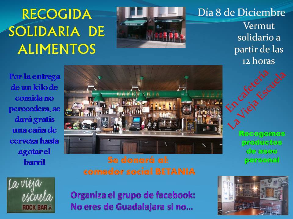 El grupo de facebook "No eres de Guadalajara, si no..." ha organizado los siguientes actos Solidarios. Se trata de 2 vermut solidarios, los cuales dos bares de la ciudad El Gamusino, donde se celebrará el 30 de noviembre y la Vieja Escuela, el 8 de diciembre, regalan un barril de cerveza para aquellos que lleven un kilo de comida no perecedra o material de aseo e higiene hasta que se acabe el barril. No obstante hay recogida de alimentos desde el día 18 hasta el 31 de Diciembre, en varios puntos de la ciudad (Little Kings, Axa, o Parafarmacia Pilar Orea), todo lo recaudado irá destinado al albergue Betanía.