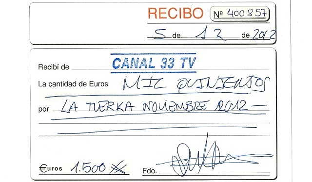 A (su móvil consta como teléfono de contacto de CMI), firmó un recibo por la producción del mismo programa, aunque en esta ocasión por 1.500 euros y sin IVA.