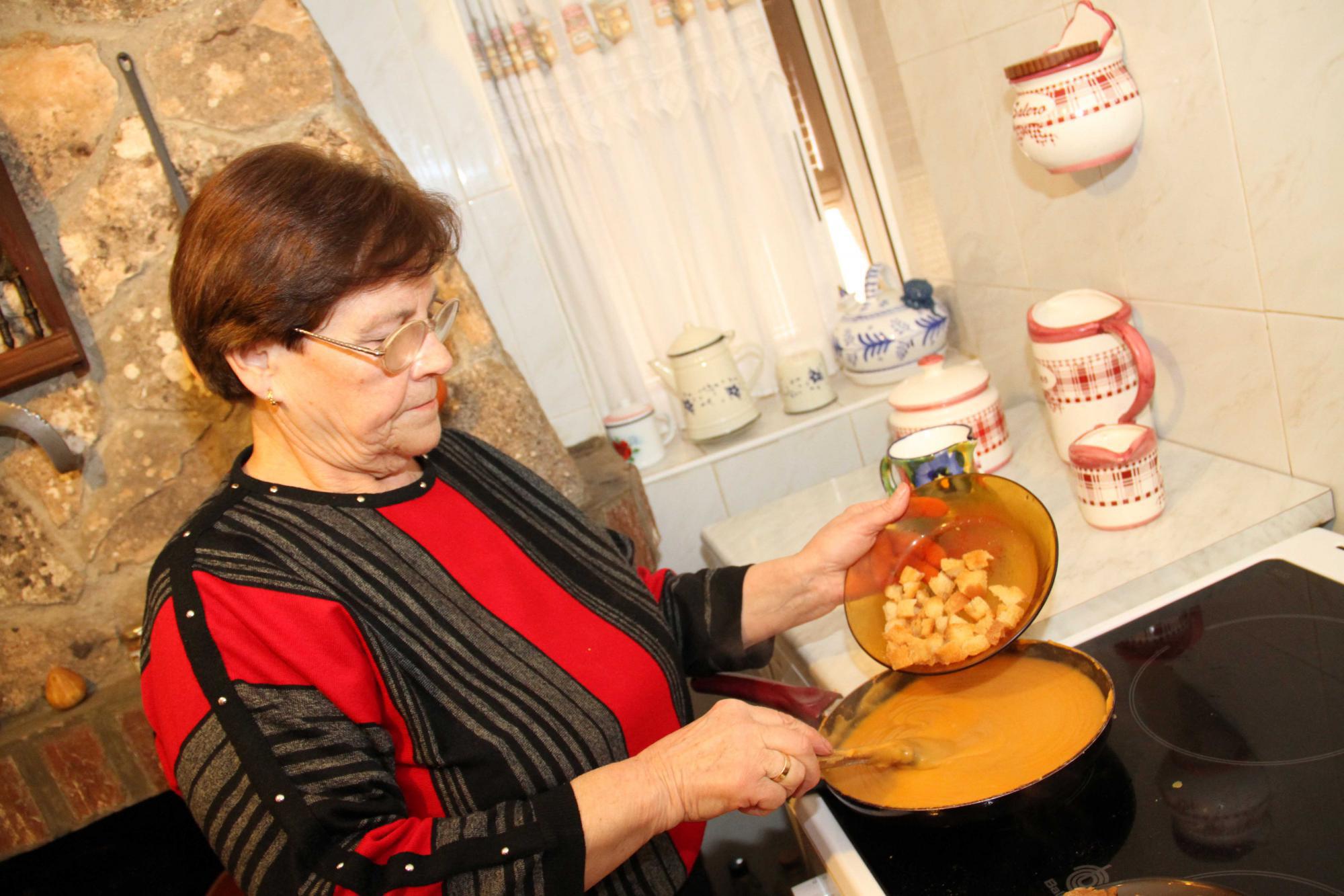 Lo primero es poner a calentar el aceite de oliva en una sartén honda. Cuando ha cogido temperatura, se vierte la panceta. En ese mismo aceite, ya mezclado con la grasilla de la carne, se añaden cuatro o cinco ajos pelados. Una vez han dejado su gusto, siempre sin que se quemen lo más mínimo, porque si se pasan lo estropean todo, Felipa los retira. Hay quien los deja. Es el momento de poner la harina, “siempre de almortas, nunca de trigo”, puntualiza la morillejana, a razón de dos cucharadas por persona. La mixtura se tuesta al fuego, al tiempo que se espolvorea con cuidado de media a una cucharada de pimentón rojo, a gusto de cada familia. A los Sotodosos-Rodrigo, les gustan bien coloraditas.