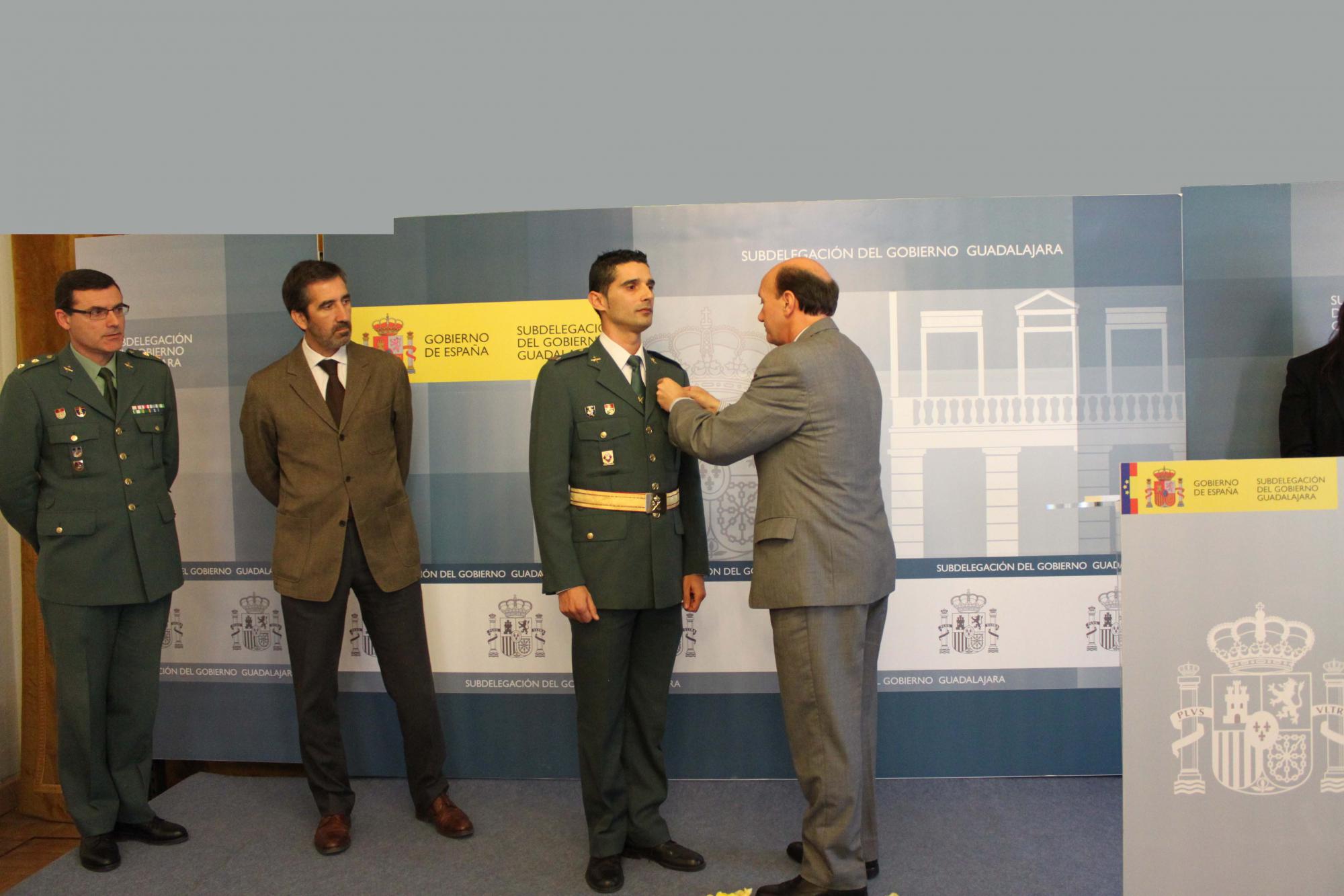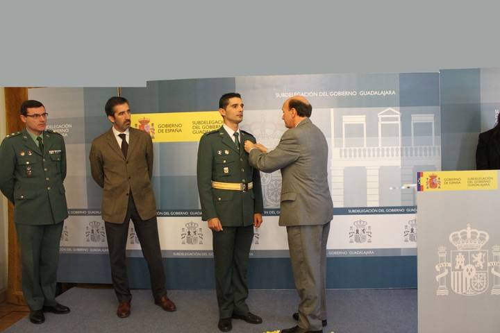 El subdelegado del Gobierno en Guadalajara, Juan Pablo Sánchez-Sánchez Seco, ha hecho entrega de la medalla al mérito de la Protección Civil en su categoría de bronce y con distintivo azul al Cabo 1º de la Guardia Civil José García del Moral, según resolución del 1 de septiembre de 2014 del director general de Protección Civil y Emergencias, por su actuación de colaboración con las autoridades competentes en la dirección y coordinación de los recursos de intervención durante la riada sufrida en las localidades de Yebra y Almoguera los días 9 y 10 de agosto de 1995.