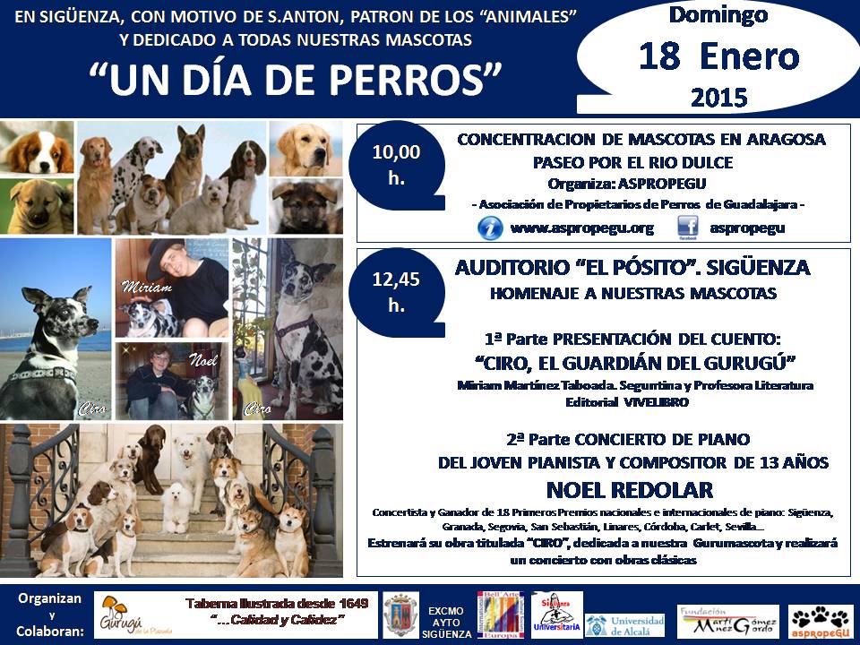 El domingo 18 de Enero será un gran "Día de perros" en Sigüenza. Organizado por la Taberna Gurugú de la Plazuela, Bell´Arte Internacional y aspropeGU. Muchas personas han colaborado con el fin de llevar a cabo un homenaje a los animales en el día de su patrono, San Antonio Abad, y “especialmente a Ciro, nuestra mascota que se fue a otra dimensión en septiembre”, dice Alberto de Mingo, tabernero del Gurugú. En la celebración colaboran escritores, músicos, veterinarios, artistas y asociaciones perrunas.