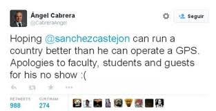 Tras cancelarse el acto, el rector ha mostrado su disgusto en su cuenta personal de Twitter: "Espero que Pedro Sánchez sepa dirigir un país mejor que sabe manejar un GPS. Disculpas a la facultad, los estudiantes e invitados por su no asistencia".