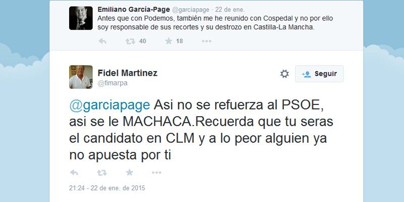 Martínez, según informa el diario Vocesdecuenca.com, a través de su perfil en Twitter reprocha al líder de los socialistas castellano-manchegos que se haya reunido "con aquellos que nos van a barrer", en referencia a Podemos.