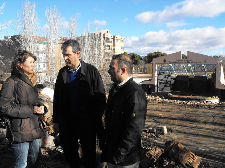 El Alcalde de Guadalajara, Antonio Román, acompañado de los concejales de Infraestructuras y Parques, Jaime Carnicero y Ana Manzano, ha visitado esta mañana los trabajos de demolición del antiguo auditorio municipal, que comenzaron el pasado jueves.