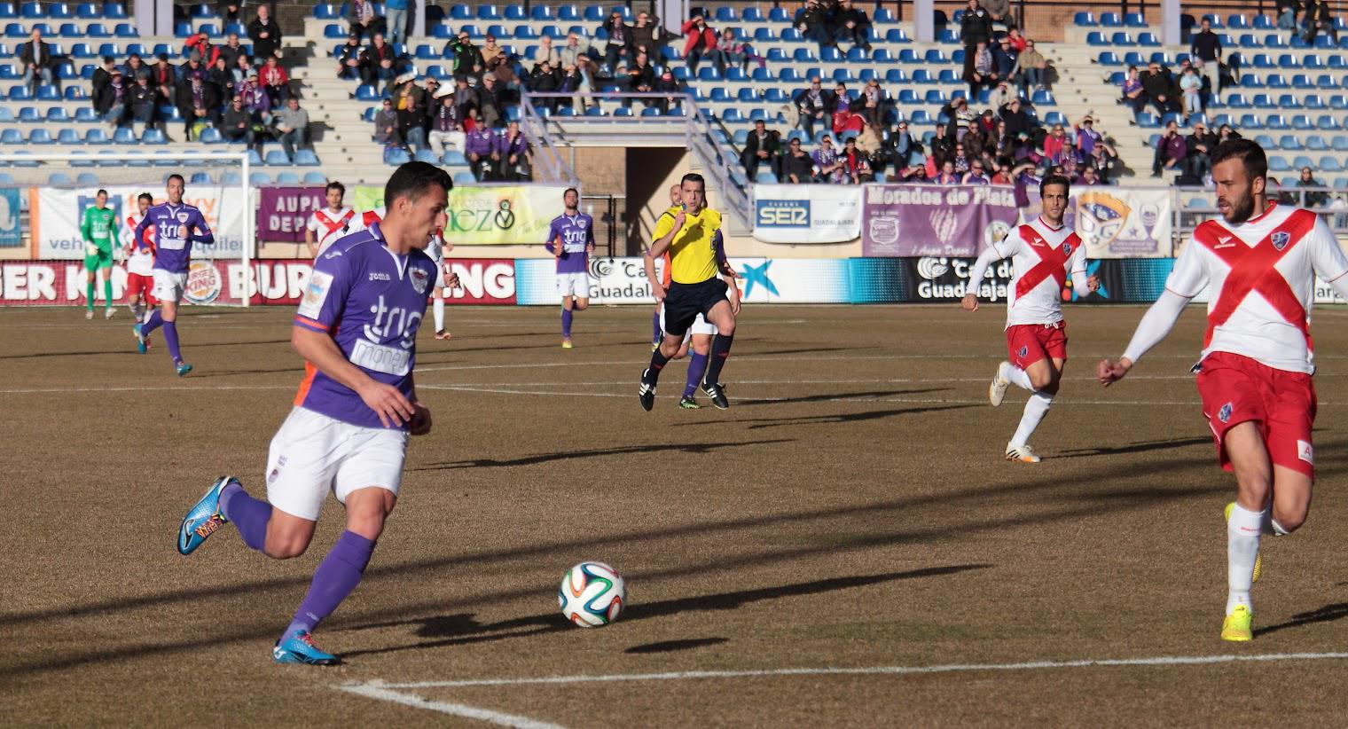 En la mitad de este primer tiempo, llegó el parón por ambos equipos que durante unos momentos, dejaron de crear ocasiones de peligro. La tregua duró hasta el 32, en ese momento, Gaspar en jugada personal, buscó algún compañero creando incertidumbre entre los morados. Los alcarreños, lejos de venirse abajo, fueron a por el partido y tuvieron sus mejores oportunidades. Primero Molinero en una contra, se quedó solo ante Dani Jiménez, pero su último control se le quedó a su pierna menos habitual, la derecha y dio tiempo a la defensa a cerrar su disparo. En el córner siguiente, fue Yebra quien remató alto, sin peligro.