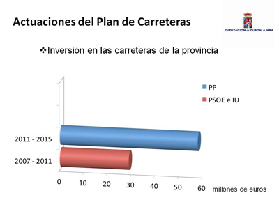 En concreto, para este año 2015 está prevista una inversión en carreteras de casi 10 millones de euros para las tres zonas: Sigüenza, Molina y Guadalajara. Cantidad similar a la que ya se invirtió en este pasado 2014. “Es importante resaltar este esfuerzo inversor y esta apuesta firme y decidida que nos ha hecho poner, en cada presupuesto, el arreglo de nuestras carreteras como un objetivo principal y primordial”, ha resaltado Guarinos, comparando la inversión de 60 millones de euros en este mandato con los 29 millones de euros invertidos en el mandato anterior, es decir, el doble de inversión.