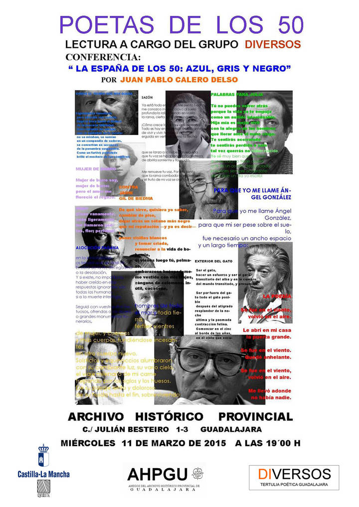 “Poetas de los 50” es el título de una lectura de poemas que llevará a cabo el grupo Diversos en el Archivo Histórico Provincial de Guadalajara. Este acto, que cuenta con la colaboración de Amigos del Archivo Histórico Provincial de Guadalajara, tendrá lugar el próximo día 11 de marzo de 2015 a las 19 horas.