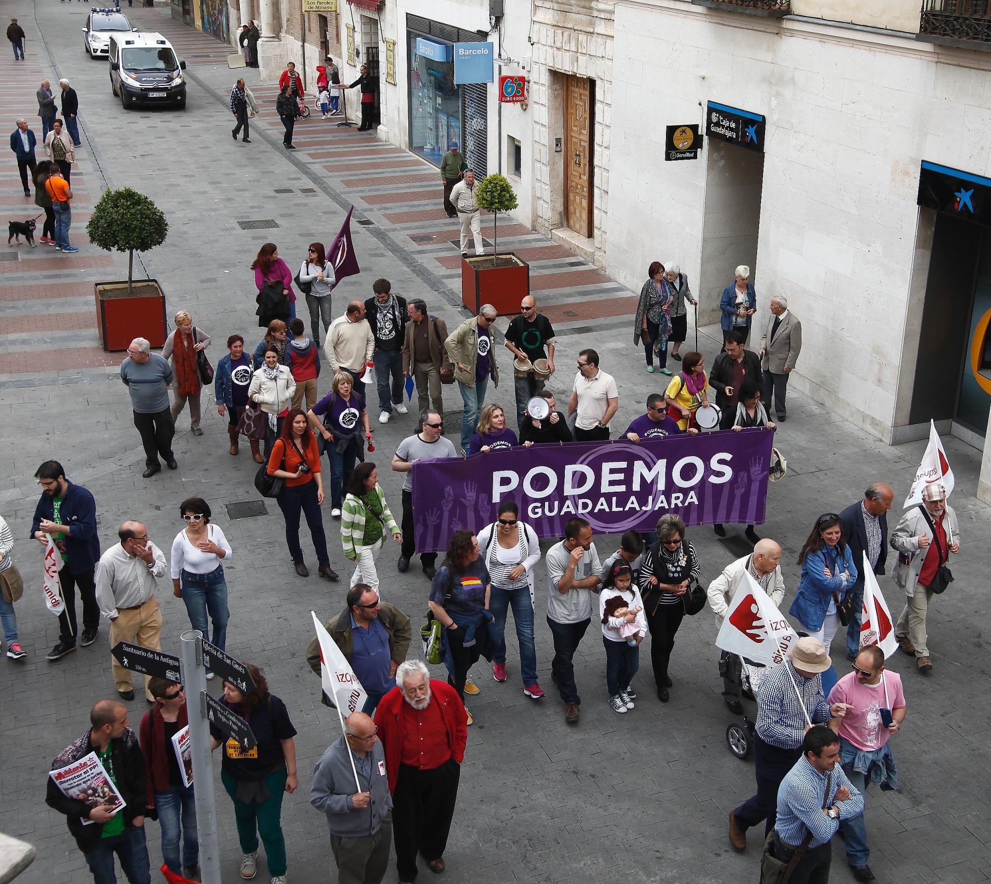 Por su parte, el partido de extrema izquierda Podemos no ha querido mojarse a nivel nacional con su asistencia o apoyo a los sindicatos, y según ha podido saber este medio, ha dejado libertad a sus círculos y simpatizantes a manifestarse libremente. En Guadalajara, apenas 25 personas, dos pequeños megáfonos y dos tambores componían la comitiva de Podemos en este Primero de Mayo.