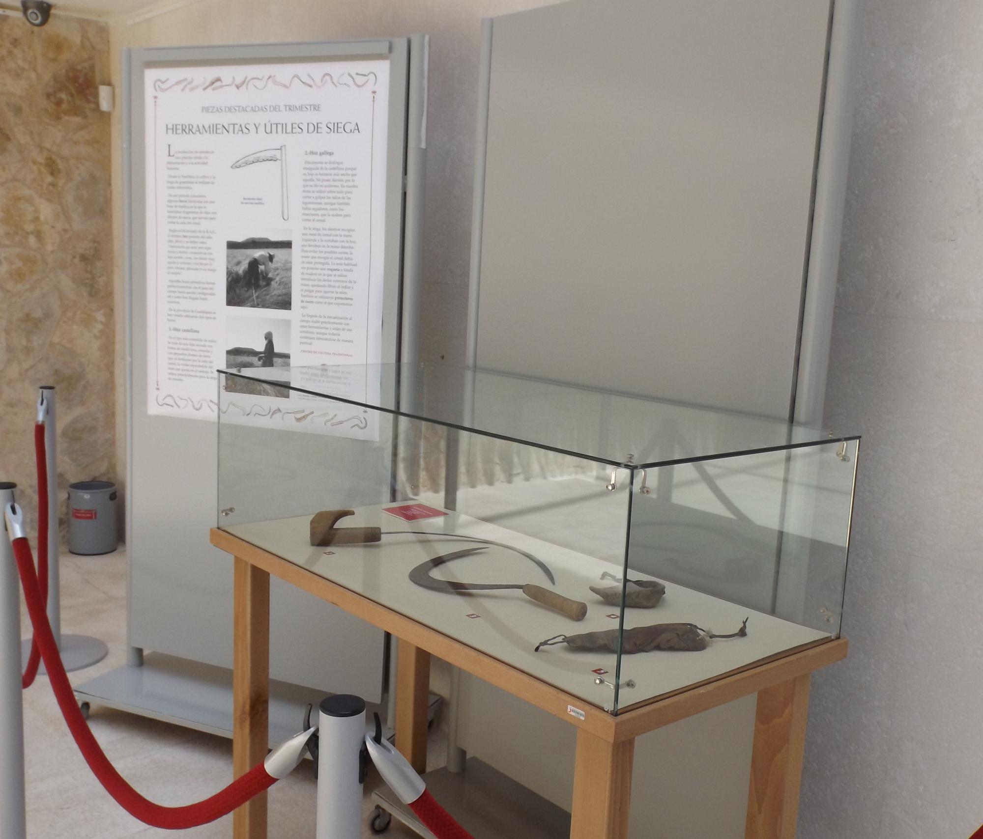Coincidiendo con el período estival y acompañadas por los correspondientes paneles documentales se exponen estas piezas que fundamentalmente son una hoz castellana (formada por una hoja acerada en forma de media luna con pequeños dientes de sierra utilizada para la siega de cereales), la hoz gallega (de hoja bastante más ancha y filo uniforme, utilizada más para cortar tallos de leguminosas) o la zoqueta (funda de madera a modo de guante para proteger la mano). La llegada de la mecanización al campo prácticamente acabó con estas herramientas.