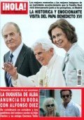 La biblia de las revistas del corazón recoge la visita de Benedicto XVI a España, por lo que el Papa protagoniza, al lado de los reyes de España, Don Juan Carlos y Doña Sofía, la portada de la publicación. ¡Hola! lleva a cabo, en sus páginas interiores, un análisis del recorrido de los reyes junto a Su Santidad en Madrid. Además, la revista destaca la reconciliación de Belén Esteban y Fran Álvarez, así como las vacaciones en Ibiza de María José Suárez y la celebración del primer cumpleaños de Daniela, la hija de Paula Echevarría y David Bustamante, esta pareja se configura como una de las más sólidas del panorama rosa.