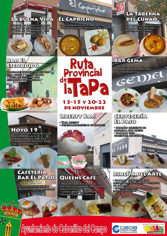 La Ruta Provincial de la Tapa en Otoño se desarrollará durante los fines de semana del 13 al 15 y del 20 al 22 de noviembre, y además de Cabanillas también cuenta con la participación de establecimientos hosteleros de la capital, Brihuega y Sigüenza.