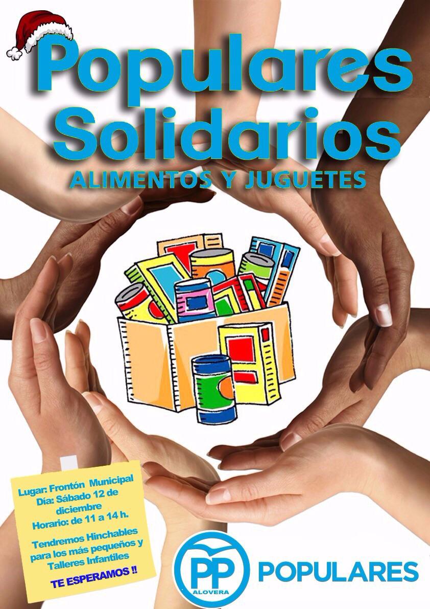 La campaña ‘Populares Solidarios’ que promueve el PP en colaboración con Nuevas Generaciones amplifica su llamada a la generosidad este sábado día 12 de diciembre desde Alovera, donde buscarán la ayuda de los vecinos para lograr que ni un solo niño se quede sin regalo esta Navidad. El punto de recogida de juguetes nuevos y alimentos no perecederos se situará en el frontón municipal entre las 11,00 y las 14,00 horas. Durante el mismo horario los más pequeños podrán disfrutar de un parque de hinchables y talleres infantiles.