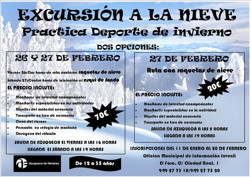 Ya se ha abierto la inscripción en dos salidas a la nieve que organiza en el mes de febrero el Ayuntamiento de Azuqueca de Henares. Las actividades, que tendrán lugar en la Sierra de Madrid, se dirigen a jóvenes con edades comprendidas entre los 12 y los 35 años. La primera propuesta consiste en dos jornadas que se dedicarán a completar una ruta nocturna con raquetas de nieve (viernes 26 de febrero) y una sesión de iniciación al esquí de fondo (sábado 27). El precio es de 70 euros (se incluye alojamiento, transporte en tren, alquiler de material, cena y monitores). Además, el 27 de febrero, se ofrece la posibilidad de completar una ruta con raquetas de nieve. En este caso, el precio es de 20 euros, con transporte en tren, alquiler de material y monitores incluidos.