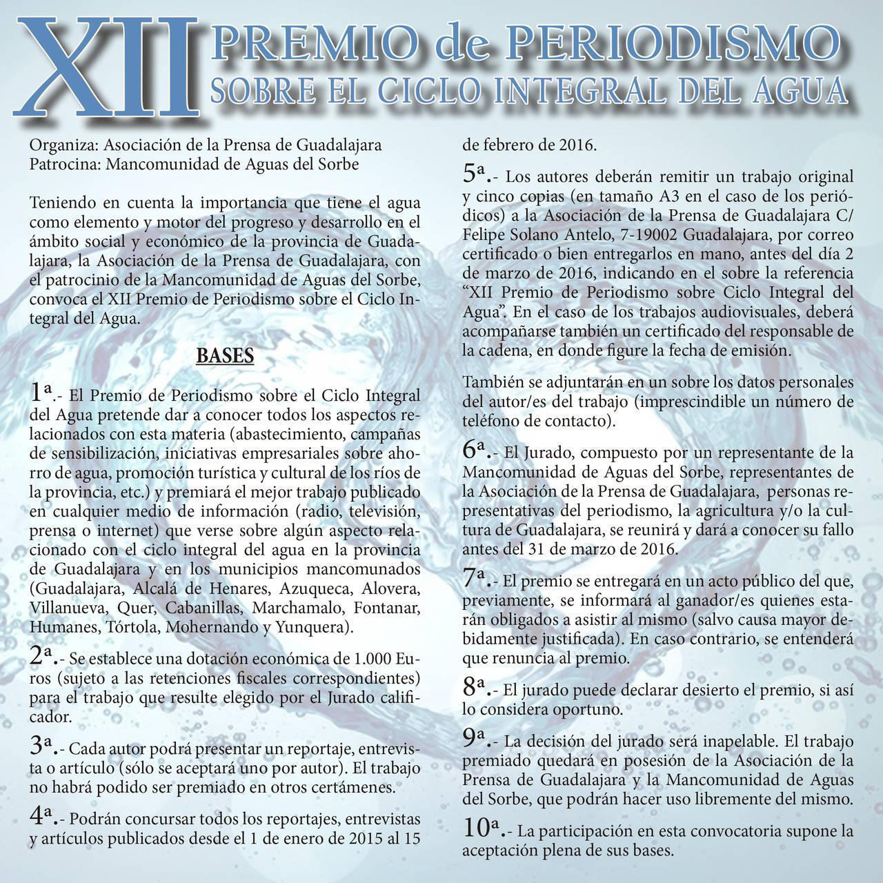 El XII Premio de Periodismo sobre Ciclo Integral del Agua, patrocinado por la Mancomunidad de Aguas del Sorbe, cuenta con una dotación económica de 1.000 euros. Pretende dar a conocer todos los aspectos relacionados con esta materia (abastecimiento, campañas de sensibilización, iniciativas empresariales sobre ahorro de agua, promoción turística y cultural de los ríos de la provincia, etc.) y premiará el mejor trabajo que verse sobre algún aspecto relacionado con el ciclo integral del agua en la provincia de Guadalajara y en los municipios mancomunados (Guadalajara, Alcalá de Henares, Azuqueca, Alovera, Villanueva, Quer, Cabanillas, Marchamalo, Fontanar, Humanes, Tórtola, Mohernando y Yunquera).