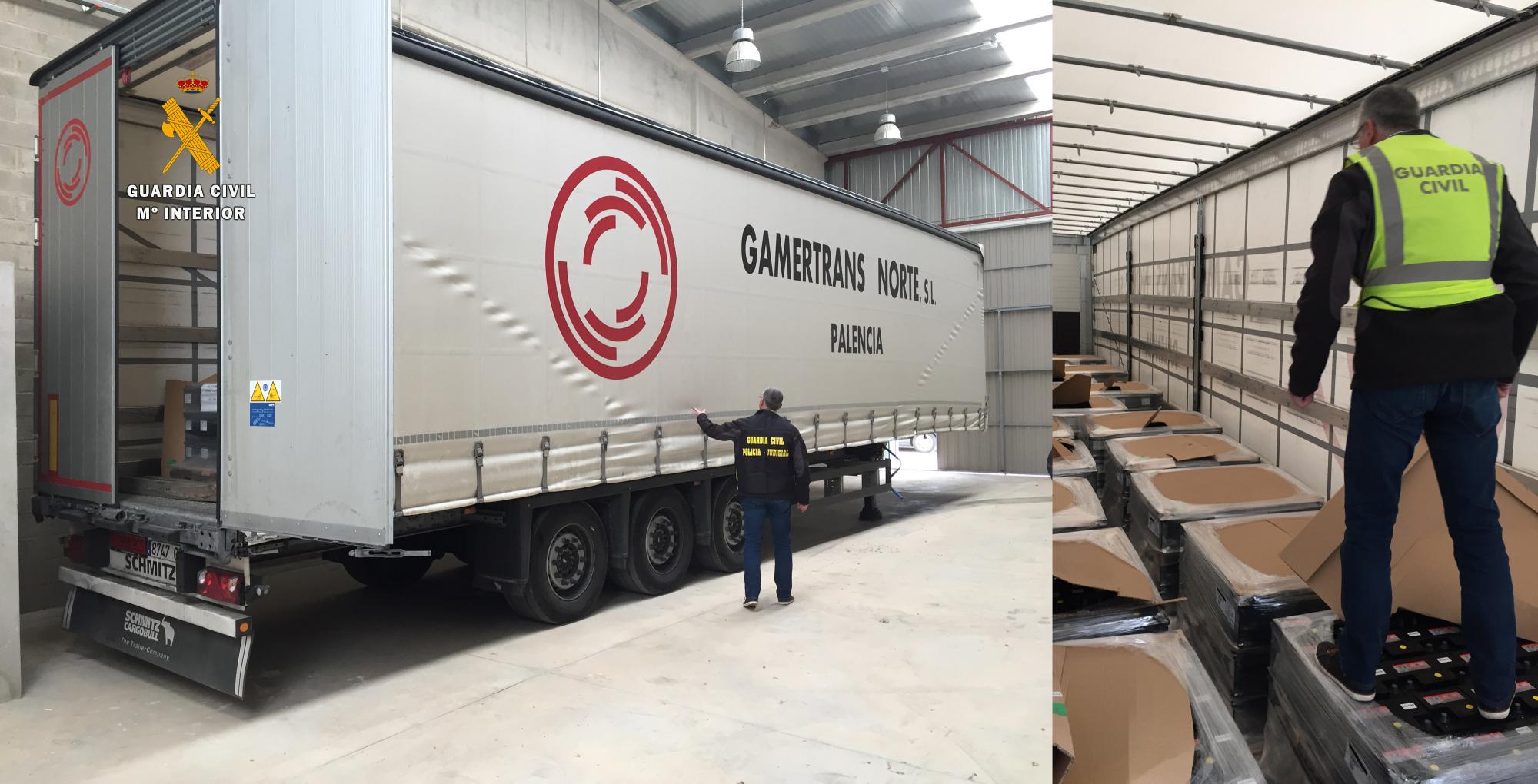 Examinada la mercancía recuperada se aprecia en un lateral de la lona del semirremolque un corte de idénticas características que los otros treinta que fueron realizados en otras tantas lonas de los estacionados en Villamuriel y 1.259 baterías.