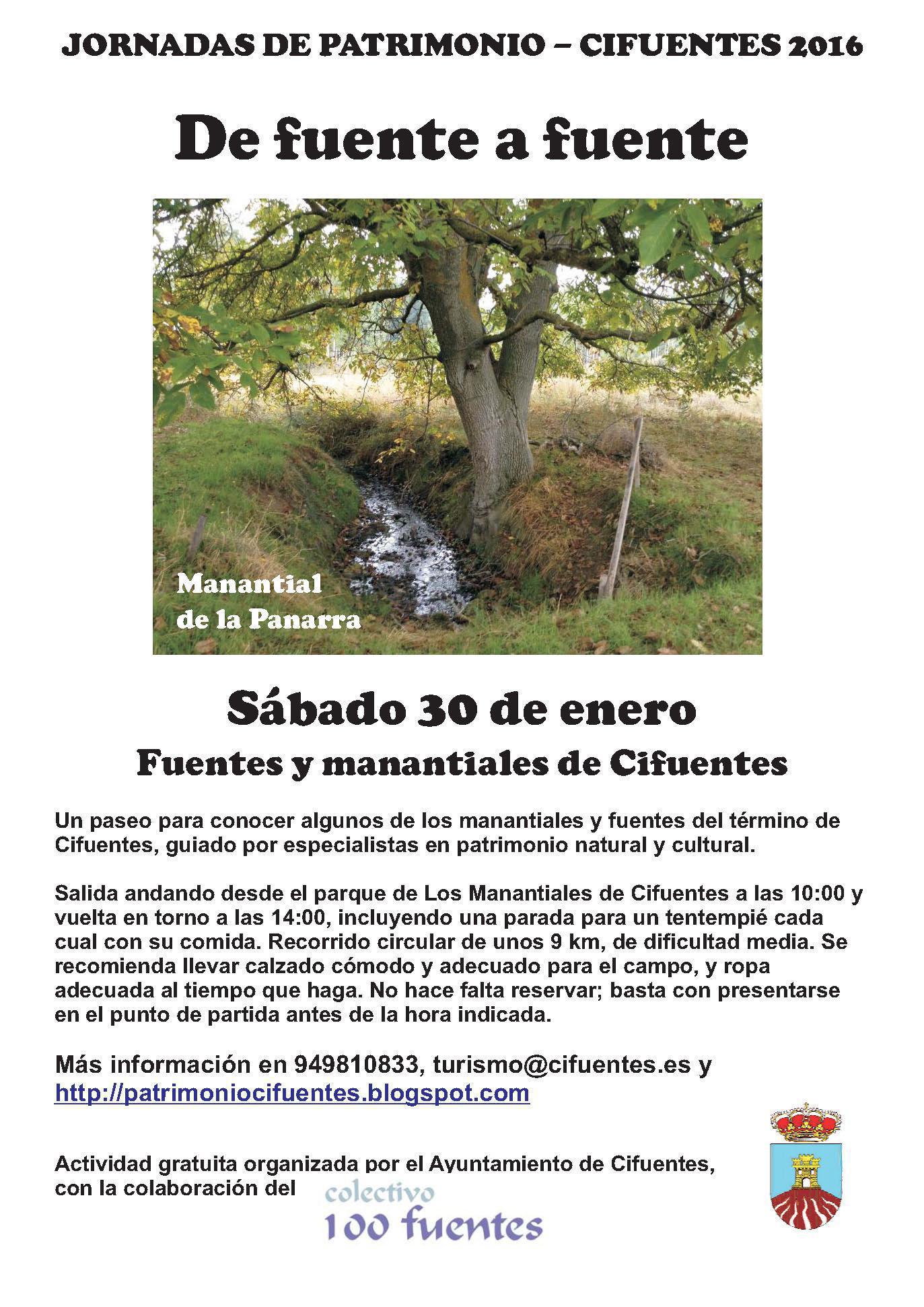 El próximo 30 de enero comienzan este año las Jornadas de Patrimonio que el Ayuntamiento de Cifuentes lleva promoviendo desde hace cinco años a través de la Concejalía de Cultura y más concretamente desde su Oficina de Turismo. Se trata de una serie de jornadas de patrimonio natural y cultural que han llamado “De fuente a fuente” y que se desarrollarán durante 2016 y 2017. Se trata de unos recorridos para conocer los manantiales y fuentes que hay en el municipio de Cifuentes y sus pedanías, con especial énfasis en su origen hidrogeológico, la biodiversidad que generan, y el patrimonio cultural tangible e intangible al que han dado lugar, tales como usos tradicionales, leyendas, infraestructura asociada, etc. Tal como se hizo en 2014 y 2015 con las jornadas de Caminos que unen pueblos, el objetivo en esta ocasión será también dar a conocer este rico patrimonio para contribuir a su conservación y puesta en valor, explicado por los expertos de años anteriores (geólogo, biólogo e historiadora).