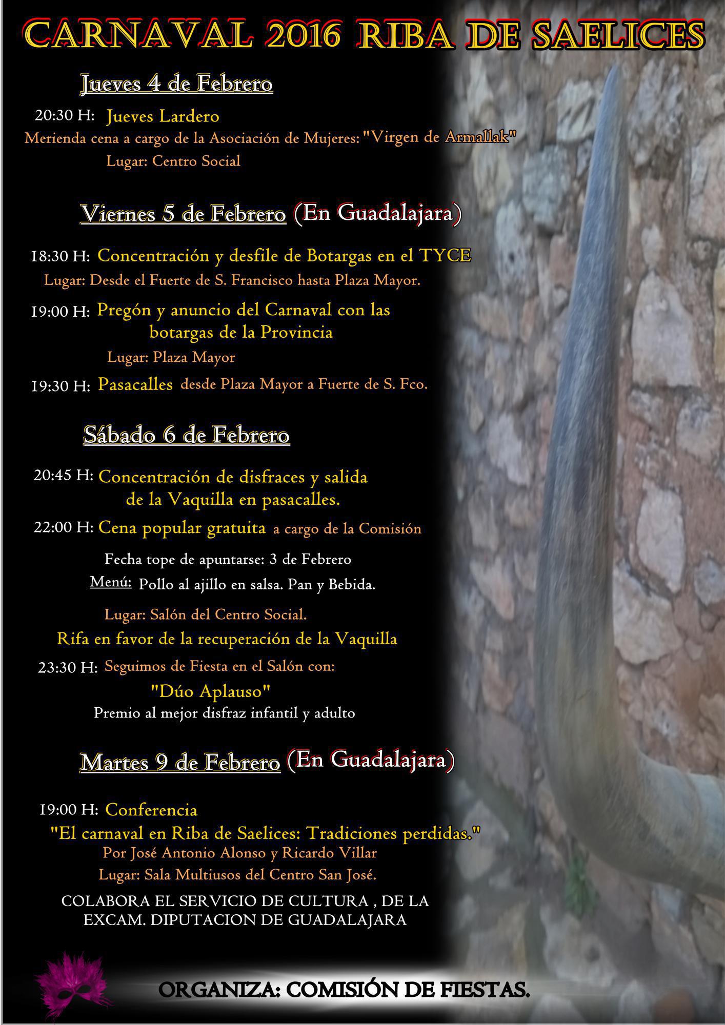 Cerrará este ciclo una conferencia en Guadalajara, bajo el título "El carnaval en Riba de Saelices: Tradiciones perdidas". Será ofrecida por D. José Antonio Alonso y D. Ricardo Villar gracias al servicio de cultura de la Excma. Diputación. La cita será el Martes 9 a las 19.00 horas en la Sala de Usos Múltiples del centro San José.