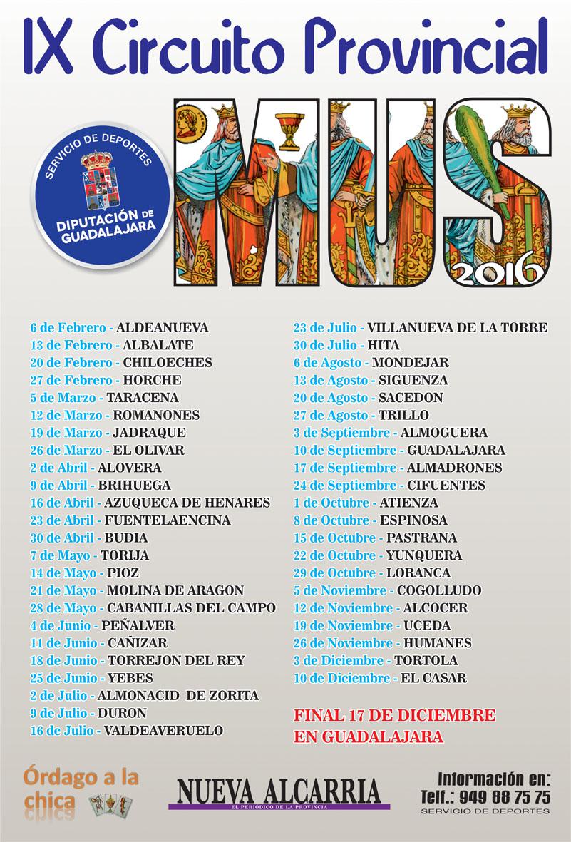 La pareja ganadora de cada sede jugará invitada en la final del Circuito Provincial de Mus a jugar el próximo 17 de diciembre en Guadalajara capital. Así mismo, las mejores parejas de cada una de las sedes tendrán un premio en metálico igual al importe total de las inscripciones de cada una de ellas, descontando el pago de la inscripción a la gran final de la pareja ganadora. También, las parejas ganadoras de cada sede podrán optar a participar en el Máster según acuerdo con la organización del mismo. Cuando sea necesario tendrán preferencia en la inscripción las parejas de cada localidad y su zona de influencia.
