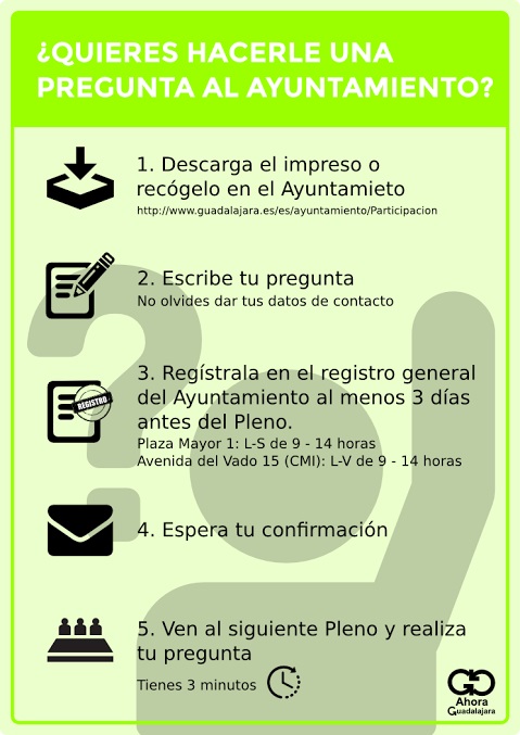 En el mes de julio, a propuesta de Ahora Guadalajara, se aprobó en el Ayuntamiento de la capital una moción, que permitirá a los vecinos y vecinas de la ciudad intervenir directamente en el Pleno Municipal. El de febrero podría ser el primer Pleno en el que algún vecino o vecina participe para realizar alguna propuesta o para comentar algún asunto de interés municipal.