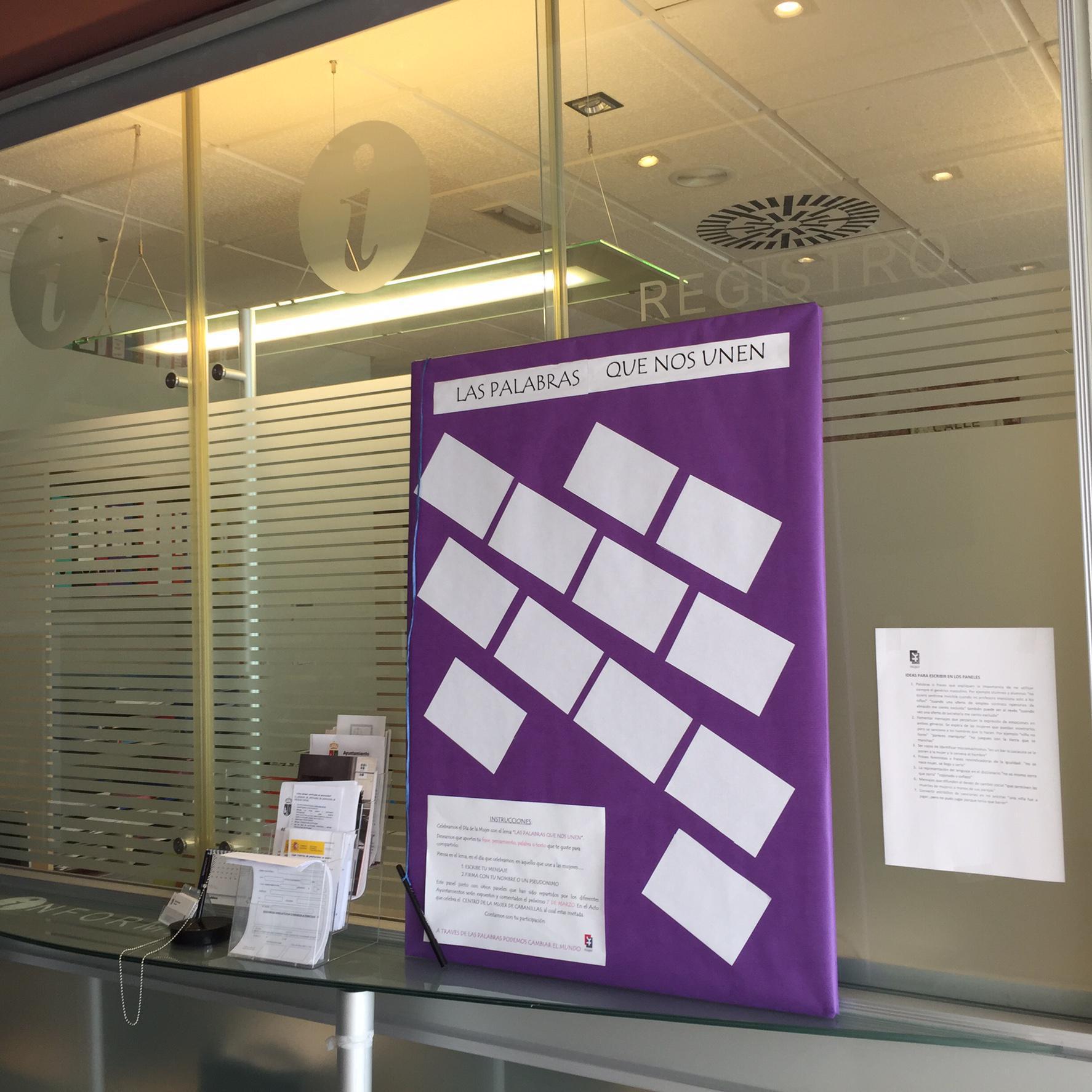 Este año, el Instituto de la Mujer de Castilla La Mancha propone el lema “las palabras que nos unen”, una propuesta que tiene múltiples interpretaciones desde diferentes puntos de vista. De acuerdo con esta reflexión, se proponen en cada una de las localidades a las que presta servicio el Centro de la Mujer de Cabanillas (Cabanillas, Torrejón del Rey, Valdeaveruelo y Quer) la participación a través de unos paneles en los que la población de cada localidad puede escribir sus sugerencias y opiniones al respecto.