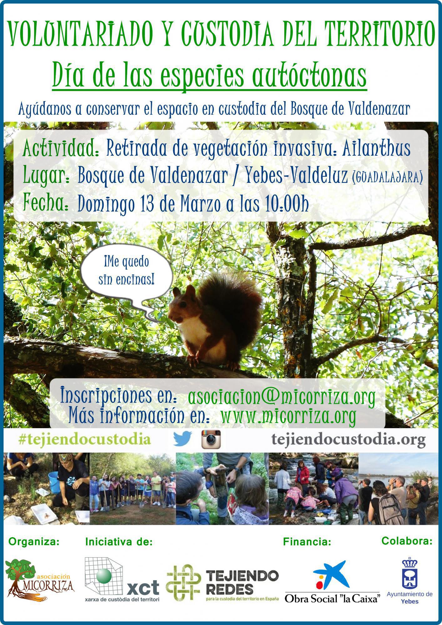 La Asociación Micorriza organiza el próximo domingo 13 de Marzo una jornada de voluntariado en el Bosque Valdenazar en Yebes – Valdeluz (Guadalajara) para la eliminación de vegetación alóctona. Esta actividad forma parte del Programa Tejiendo Redes para la Custodia del Territorio en España, una iniciativa de la Xarxa de Custodia del Territori y la Obra Social “la Caixa”, con el que se realizarán numerosas actuaciones en esta fecha conmemorando el Día de las Especies Autóctonas.