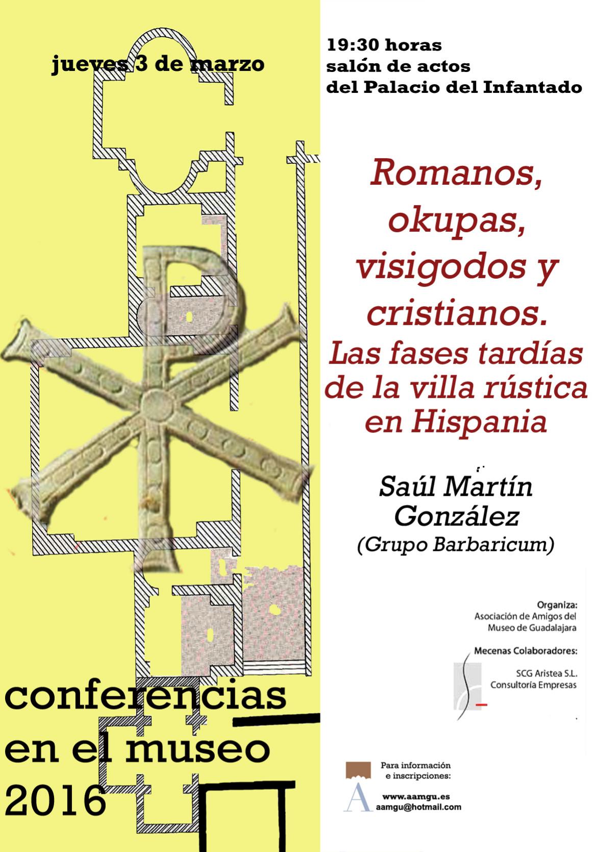 El próximo jueves, día 3 de marzo, tendrá lugar a las 19,30 horas en el Salón de actos del Palacio del Infantado la conferencia que lleva por título “Romanos, okupas, visigodos y cristianos. Las fases tardías de la villa rustica en Hispania”, que será impartida por Saúl Martín González (Grupo Barbaricum).