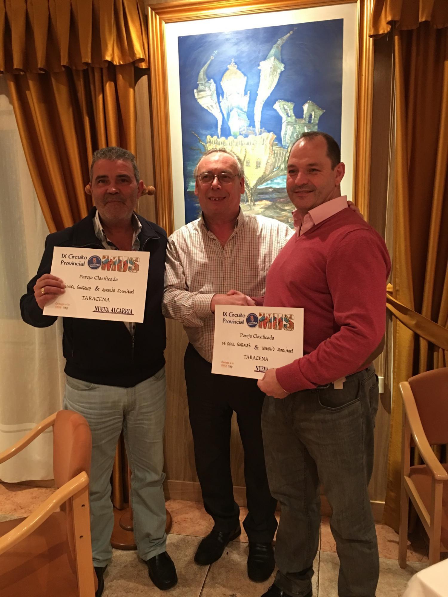 Miguel González y Aurelio Somolinos dos jugadores bien conocidos en el panorama provincial aunque en raras ocasiones jueguen juntos se alzaron con el triunfo y su correspondiente clasificación para la final provincial a celebrar el próximo 17 de diciembre en Guadalajara capital tras afrontar una última ronda frente a los experimentados Mercedes Lara y Pedro Jurado. Desde estas líneas felicitar a la pareja clasificada: Aurelio toda una "leyenda" viva en el mundo del mus y a Miguel que día a día demuestra estar a un nivel óptimo de juego.